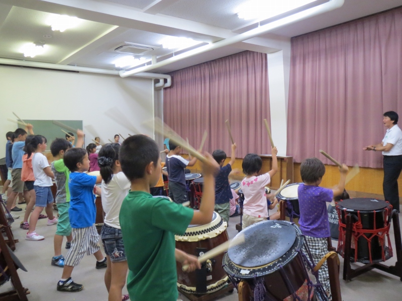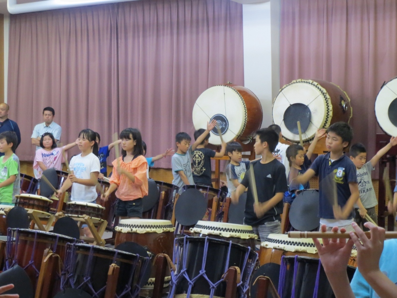 | 2014/06/22 合宿を終えて思うこと 今回の合宿で得るものがたくさんありました。 太鼓に一生懸命向き合っていた子達の人としての成長をいろんな場面で感じました。 今までは、休憩というとはしゃぎまわっていた子が、合宿2日目には、休憩といたら、自主練をしていました。(拍手) 合宿最後の演奏では、桶胴太鼓から宮太鼓に挑戦しました。とっても素晴らしい演奏ができるようになっていました。(拍手) 背中でズドン! 振り返ると、慎重派の子が思いっきりキレのある音を出していました。音も顔つきも全然別人になっていました。(拍手) 叱ることも時には必要ですが、その子の素晴らしさを認めてあげることで、本人がどう気づき変わっていくか、これからが楽しみです。小さな先生もそうです。みんなの前で子ども達が発表するのもそうです。一人ひとりのいいところを見つけては子ども達に伝え、讃えます。 「しつけを押し付けない!」私の流儀です。 脱皮しそうな子どもが何人かいます。そのたんびにうれしいです。だから、打吹童子ばやしの指導者としてやりがいがあります。 合宿や特別練習会では、ゆっくりと子ども達と会話することができます。