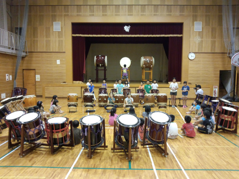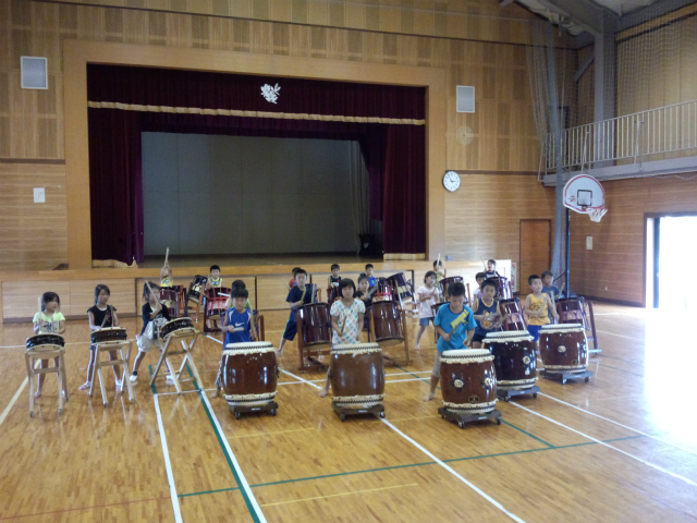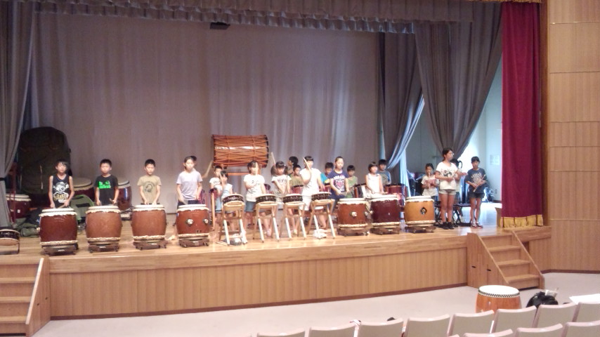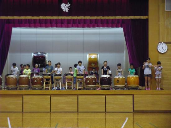 | 2013/07/17 定例練習会 とってもメリハリのある練習ができました。 今日は、レギュラーチームはステージに、チーム01はアリーナに太鼓を向い合せにセットしました。 打吹童子ばやしレギュラー組が、「打吹童子ばやし」プロローグを演奏。 次は、チーム01が「童子01」を演奏。 今度は、打吹童子ばやしレギュラーが「打吹童子ばやし」1章を演奏→チーム01が「童子01」を演奏。 打吹童子ばやしレギュラーが「打吹童子ばやし」2章を演奏。→チーム01が「童子01」を演奏。 打吹童子ばやしレギュラーが「打吹童子ばやし」3章を演奏。→チーム01が「童子01」を演奏。 打吹童子ばやしレギュラーが「長谷寺の絵馬伝説」を演奏。→チーム01が「童子01」を演奏。 打吹童子ばやしレギュラーが「ばえん祭」を演奏。→チーム01が「童子01」を演奏。 打吹童子ばやしレギュラーが「MATSURI」を演奏。→チーム01が「童子01」演奏。 打吹童子ばやしレギュラーが「打吹童子ばやし」プロローグ・1章を演奏。→チーム01が「童子01」を演奏。 打吹童子ばやしレギュラーが「打吹童子ばやし」2章・3章を演奏。 最後は、チーム01も太鼓のセットを保護者の皆さんの方に向けて・・・。レギュラーは、お客様になって、保護者のみなさんと一緒に、チーム01の演奏を聴きました。 最後はちゃんとビシッと決めます。かっこいいです。今日も、大番くんと木下君がチームを引っ張りました。かっこいい演奏です。なんか感動しちゃいます。 あいちゃん、みゆうちゃんもかっこいいです。直也くんもすごくいい感じです。 締め太鼓では、あやかちゃんがレギュラーのような演奏をしていました。すごいすごい! 最後は全員で「MATSURI」を演奏して終わる予定でしたが、チーム01は、体力の限界を超えていましたので・・・。 レギュラーが、「MATSURI」を演奏し、01メンバーは決まりよく座って観ました。 集合! 5・4・3・2・1 残ってる元気を振り絞ってワッショイコール♪ リーダーが「これで太鼓の練習を終わります。ありがとうございました。」「ありがとうございました。」 打吹まつりの打ち合わせをしました。