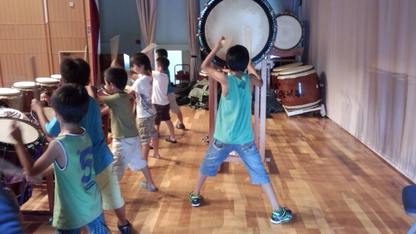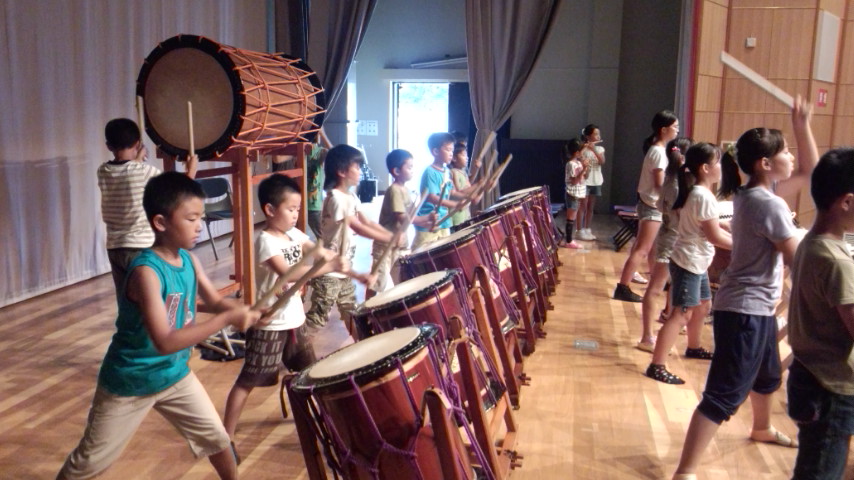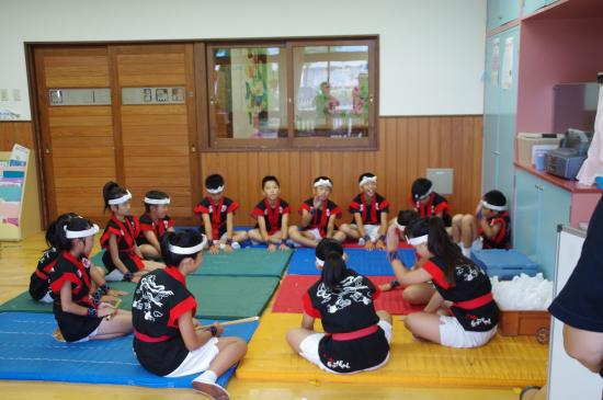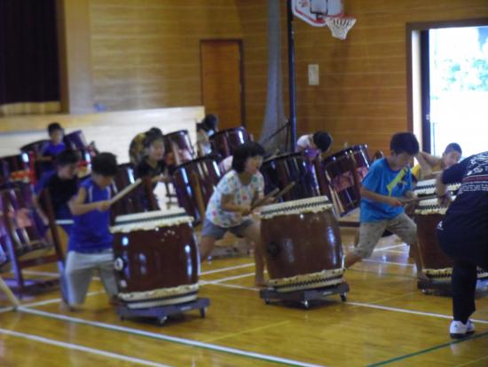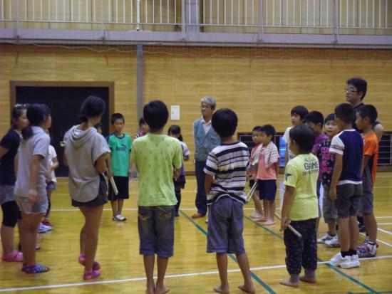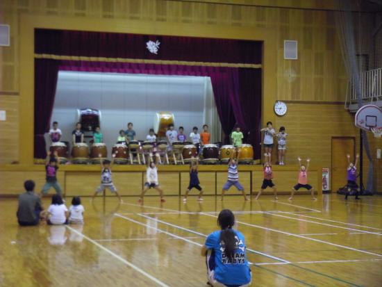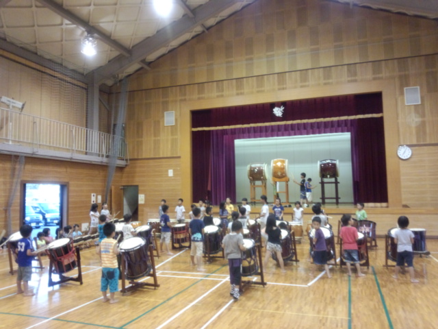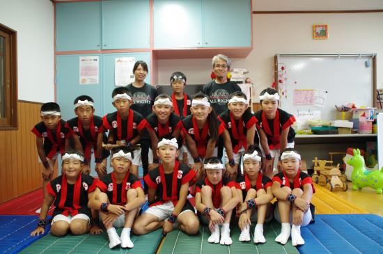 | 2013/07/14 チーム01特別練習会と親子交流会をしました。 午後1時から3時30分まで さんさんプラザ体育館で、入団1〜2年目の「チーム01」の特別練習会をしました。 むし暑い中でしたが、みんなが頑張りました。 チーム01レギュラーがたくさん誕生しました♪ 01レギュラーゾーンはグリーンカードです。一生懸命練習を頑張りました。凄い集中力とやる気の本気の姿勢がかっこいいです。 ちょっと暑さとの戦いに集中力が維持できないメンバーのゾーンはイエローカード。(サッカーのイエローカードとは関係ないですよ。体育館のコートの線の色です。)ほんとに暑さとの戦いでした。・・・休憩になるととたんに元気になって走り回っています。「おいおい!逆ですよ。」 いよいよ「童子01」の曲も新しいフレーズが追加になって、完結です。「童子01」は、2分の曲です。 この2分間、集中力を崩さず頑張れる力がついてきました。 2分演奏しては、5分休憩をして水分補給やトイレです。太鼓の練習時間よりも休憩のほうが長いです。 精神力! 「心技体」 まさに和太鼓道です。 和太鼓は、体力がないと演奏できません。4月入団から3か月。01メンバーはずいぶんたくましくなりました。 ・・・トイレのスリッパも揃えれるようになりました。・・・これからも繰り返しです。太鼓も頑張るけど、あたりまえのことがあたりまえにできる01レギュラーを目指して頑張りましょう!! 最後に、かっこいい「童子01」の演奏を保護者のみなさんに聞いてもらいました。最後の2分間の集中力を見てもらいました。 2年生の宮太鼓チームは素晴らしい演奏です。ちょっと感動です。みんなが、最後の2分頑張りました。 「童子01」は休憩するところがない曲なので、たった2分の演奏ですが、とっても体力を使います。そこがとってもかっこいいところです。もう、汗びっしょりです。 最後のあいさつは、残っている元気を振り絞って、先生対みんなでワッショイコールです。「ワッショイ!ワッショイ!」 気持ちのいい声が響きました。 「これで、太鼓の練習を終わります。ありがとうございました。」「ありがとうございました。」 あいさつは、全員がレギュラーです。 その後会場移動をして、親子交流会をしました♪ |