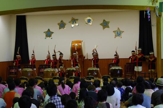 | 2013/07/06 長瀬保育所(湯梨浜町)「アロハまつり」で22期レギュラーが堂々と演奏しました。アンコールもいただきました。 7月6日(土) 湯梨浜町立長瀬保育所の「アロハまつり」(七夕会)に出演しました。22期打吹童子ばやしのデビューです♪ 14時30分に集合して、団員と保護者の皆さんに手伝ってもらってでセッティングし、リハーサル開始です。 通しリハーサル終了後に控室にて、着替えた後に手打ちにて最終確認をしました。 そして、いよいよ演奏開始です。まずは「鼓魂〜しめ太鼓バージョン」 つづいて「MATSURI」 22期リーダーより観客の皆様にあいさつです。良く通る声でとても良い挨拶です。 挨拶後に童子ばやしの代名詞「打吹童子ばやし〜天女と童子の物語」 演奏終了後、たくさんの拍手喝采をいただきました。 その中から「アンコール!」の声をいただき会場全体に「アンコール」のコールが響きました。 とてもありがたいアンコールに答えまして「新・八犬伝」より宴の章を演奏させていただきました。 団員の踊りに合わせて踊ってくれている子もいました♪ 演奏終了後に再びたくさんの拍手喝采をいただきました。来場されていた方々より「すごいね〜」・「迫力あったー!」などたくさんの言葉もいただきました。 団員たちは長瀬保育所の園児たちよりハイタッチを求められていました♪ 今回は22期童子ばやしレギュラーメンバー14人の初公演でしたが、堂々と素晴らしい演奏をしてくれました♪ 今回演奏の機会を与えていただきました、長瀬保育所職員様・保護者会様に心より感謝いたします。 |