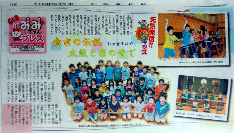 | 2013/07/07 「みみちゃんプレス」日本海新聞で打吹童子ばやしが紹介されました。 7月7日(日)付の日本海新聞「みみちゃんプレス」の「元気発信!!GOGOキッズ」に先日取材を受けた記事が掲載されました。 大変素晴らしい記事にして頂き、感謝感謝です。 童子ばやしのメンバーはこの記事の内容に負けないように頑張って行きましょう!! |