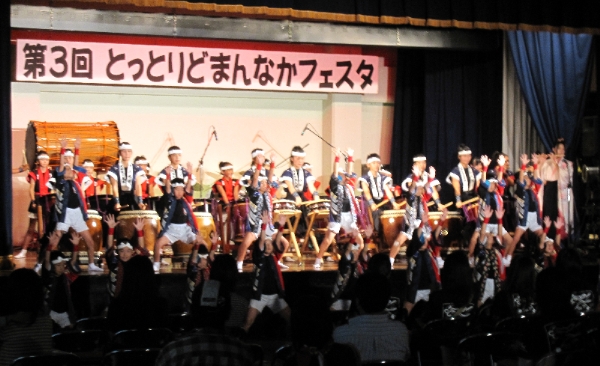 | 2009/10/04 どまんなかフェスタで迫力満点の演奏をしました。 湯梨浜町の中央公民館(旧東郷町役場講堂)で11時55分より演奏をしました。 気持ちの入った演奏だったと思います。 また、少しステップアップしました。いよいよ来週ですね。 |