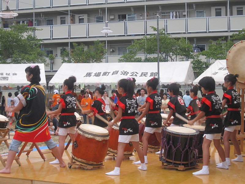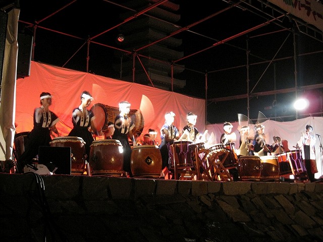 | 2009/08/08 馬場町夏祭りで有志が演奏しました。 馬場町在住の打吹童子ばやしメンバー10人に友達有志6人が加わって、「長谷寺の絵馬伝説」「宴〜新・八犬伝より」を演奏しました。 |