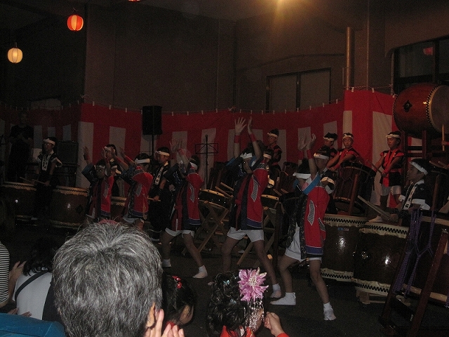 | 2009/08/22 福祉の里交流パーティーで 福祉の里ふれあい交流パーティーで、日本のまつり鳥取に向けてのテスト演奏をしました。 八犬士8名と雷鳴組12名の太鼓と伏姫篠笛隊4名で奏者は24名。宴の曲から踊隊26名が合流。 総勢40名が出演しました。 中学生組にとって久しぶりのお客様を前にしての演奏です。緊張したようです。 打ちは充分だけどまだまだ腕が振りあがらないねえ。(課題) 雷鳴組は、打ちも腕の振り上げも充分でしたよ。 宴では、26名の踊り子登場に「うわ〜。」と客席がどよめきました。 子ども達の手拍子の催促に、会場は手拍子の音と笛と太鼓の音に包まれました。 最後の「やー!」の決めのポーズで歓声と拍手の渦に包まれました。思わず胸が熱くなりました。 控え室に帰ってきた子ども達に礼を言いました。 素晴らしい演奏でした。課題もあるけど今日はありがとう。 お客様から「素晴らしかったね〜。」「いい物見せていただいた。」の声に、また子ども達に感謝です。 子ども達を目の前にして、総括をするのに涙ぐんでしまって話すことができませんでした。 2006年の発表のときの感動と今日の子ども達の成長ぶりが折り重なって胸が熱くなりました。 保護者の皆様にも感謝です。みんなが協力し合って50人の大所帯の舞台を支えていただきました。 さて次は、9月13日の梨花ホールでのリハーサルですね。今日のステージでの課題をそれぞれが練習して行こうね。 |